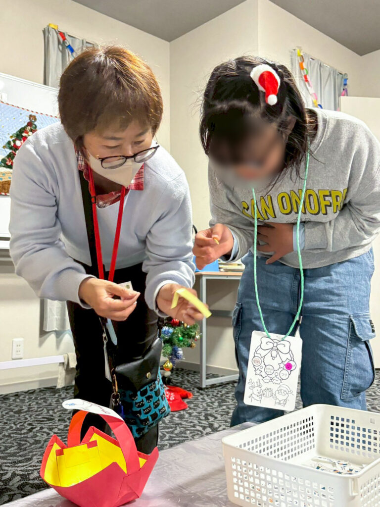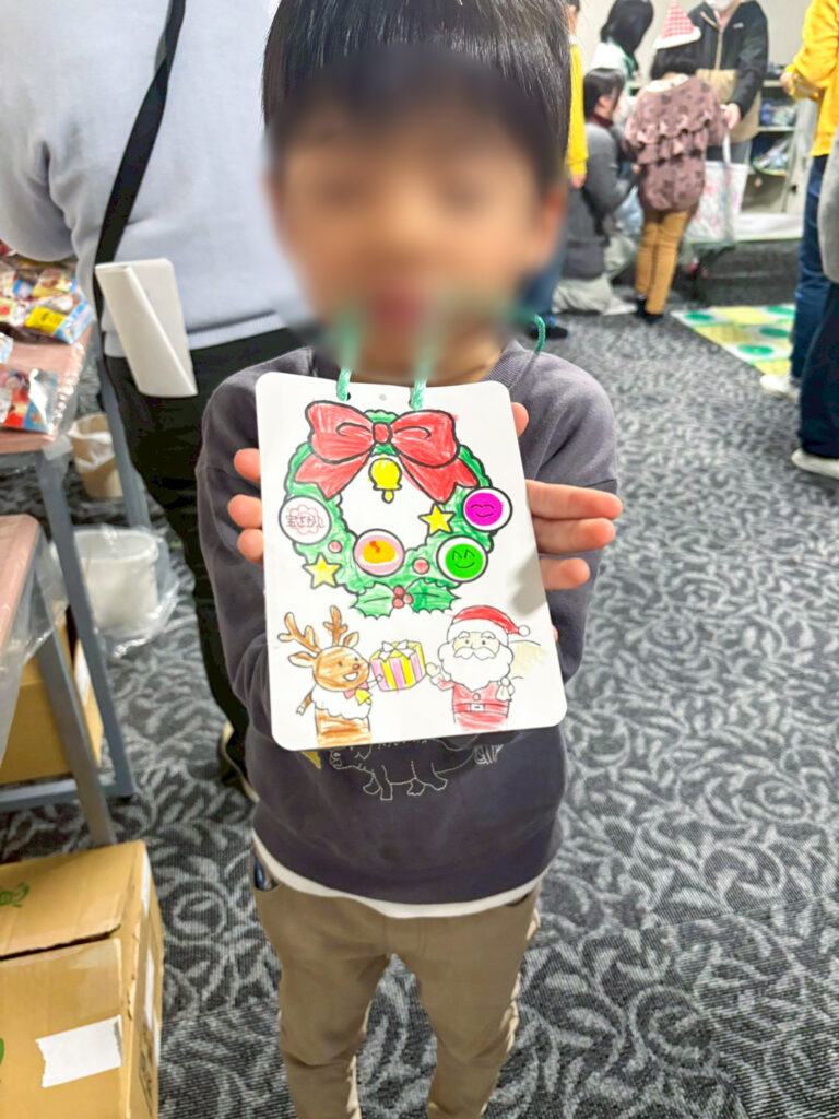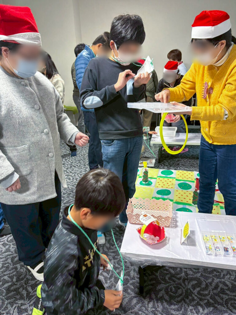 スタッフ手作りの「つまみ細工のクリスマスリース」の前で写真撮影をしたあとは、前半のゲームで集めた材料を使って、制作の時間へ。